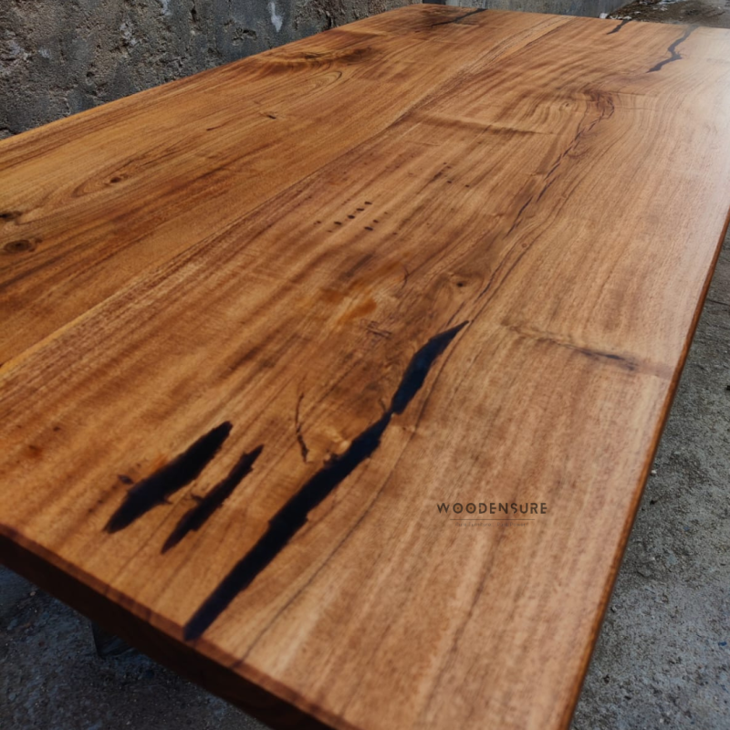 Overall, an acacia live edge dining table with little black epoxy resin work is a unique and eye-catching piece that combines the natural beauty of wood with modern design elements. It can be a great addition to any dining room or kitchen, adding character and style to your space while providing a functional surface for dining and entertaining.